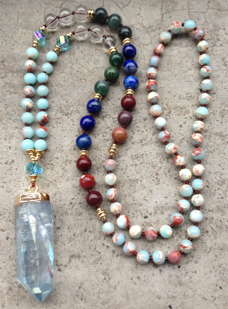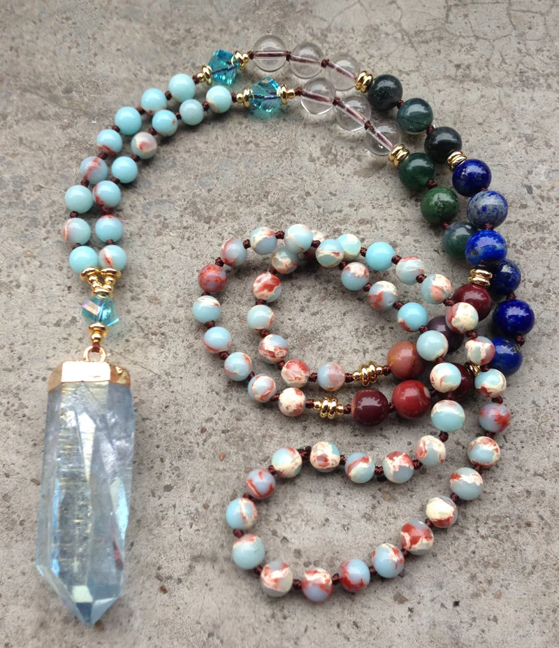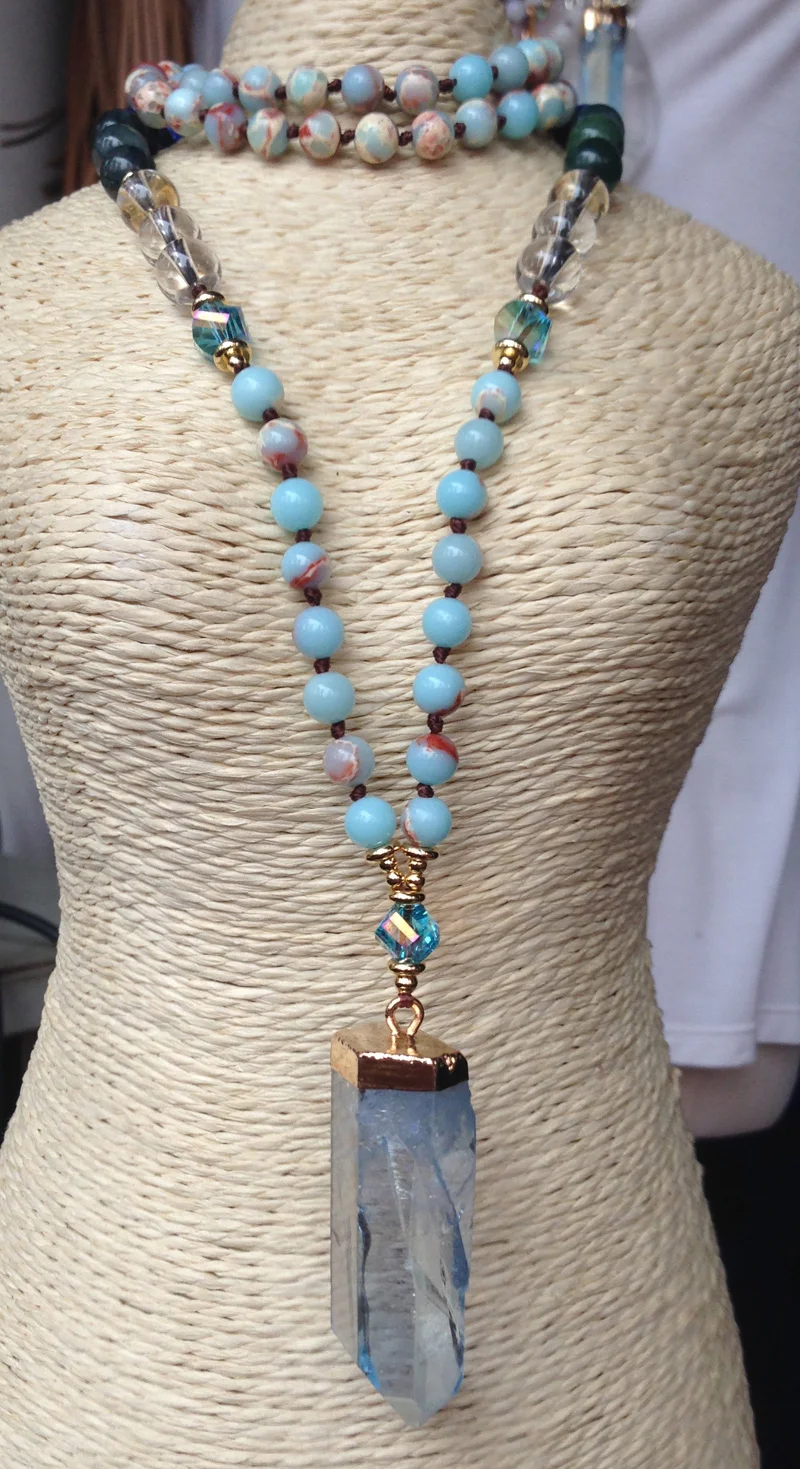 Blue Quartz Point Pendant Stone Knot Beads Necklace