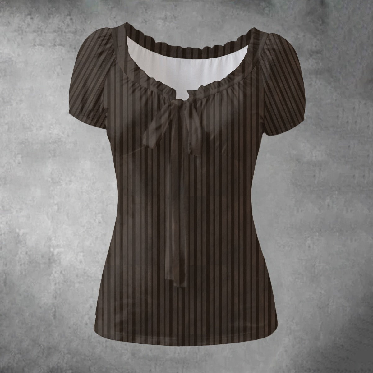 Embrace vintage elegance with this brown pinstripe puff sleeve blouse, inspired by 1950s fashion and perfect for a Dark Academia or Corporate Goth wardrobe. Crafted from a soft blend of polyester and spandex, it offers comfort and breathability throughout the day. The pleated design and puff sleeves add refined volume and detail, making it ideal to wear under a blazer for a polished office look or paired with jeans or a mini skirt for stylish versatility. Explore matching pieces in the Corporate Goth collection to complete your ensemble.