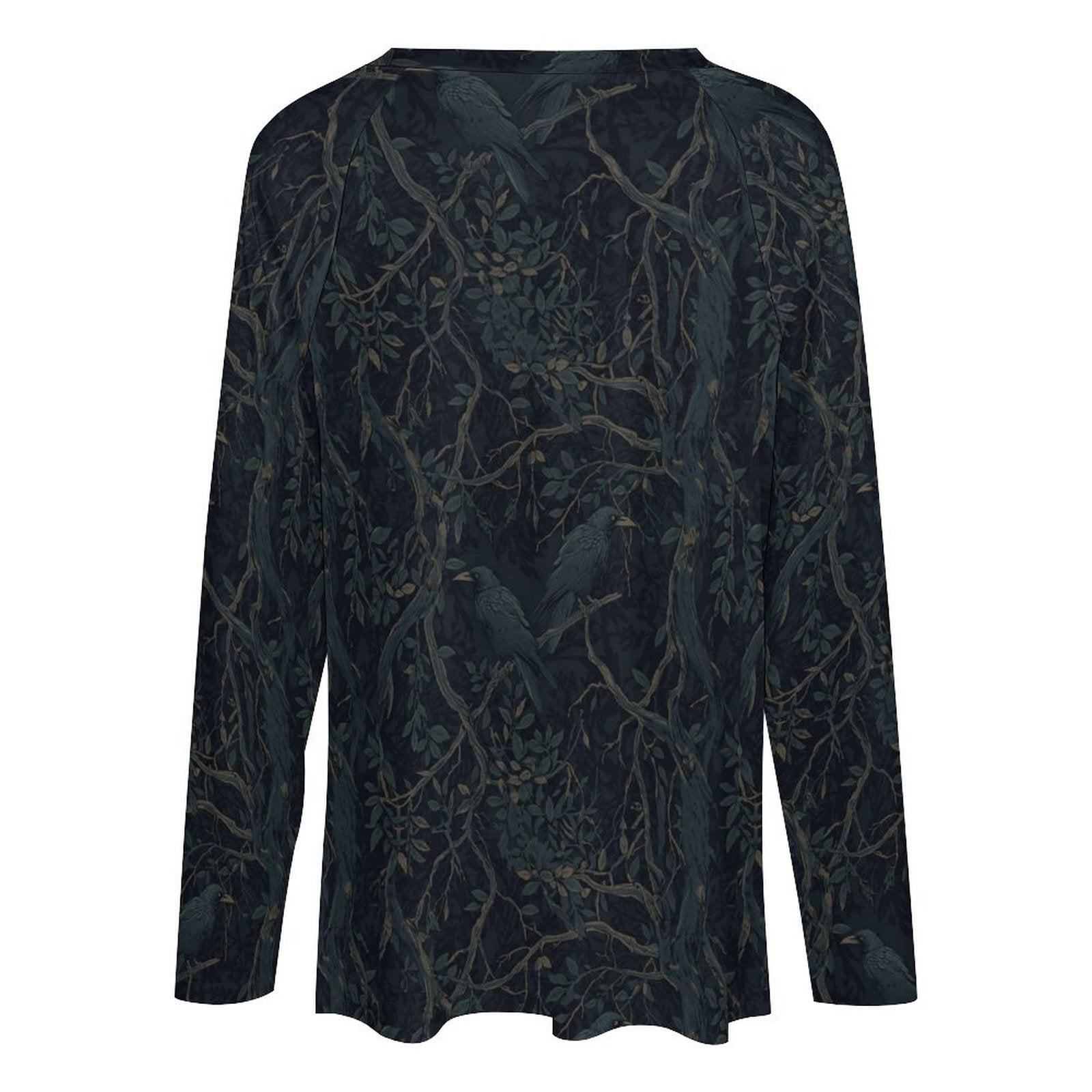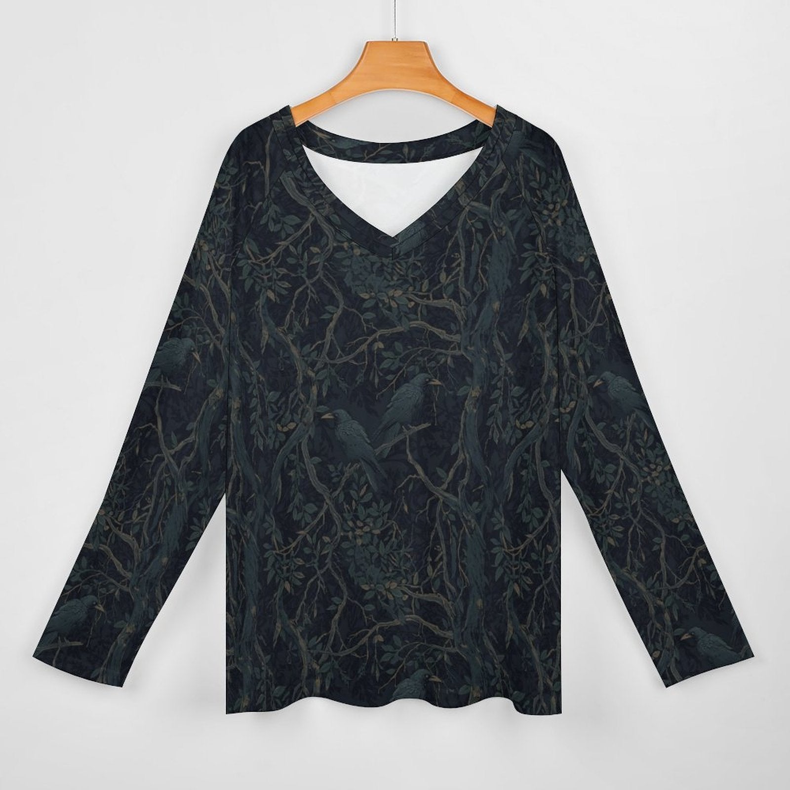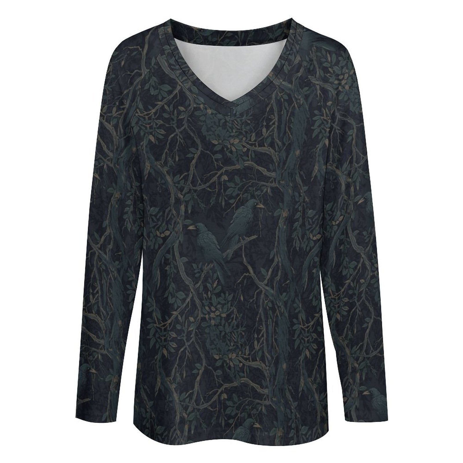 Crow V-neck Loose Long Sleeve T-shirt(All-Over Printing)
