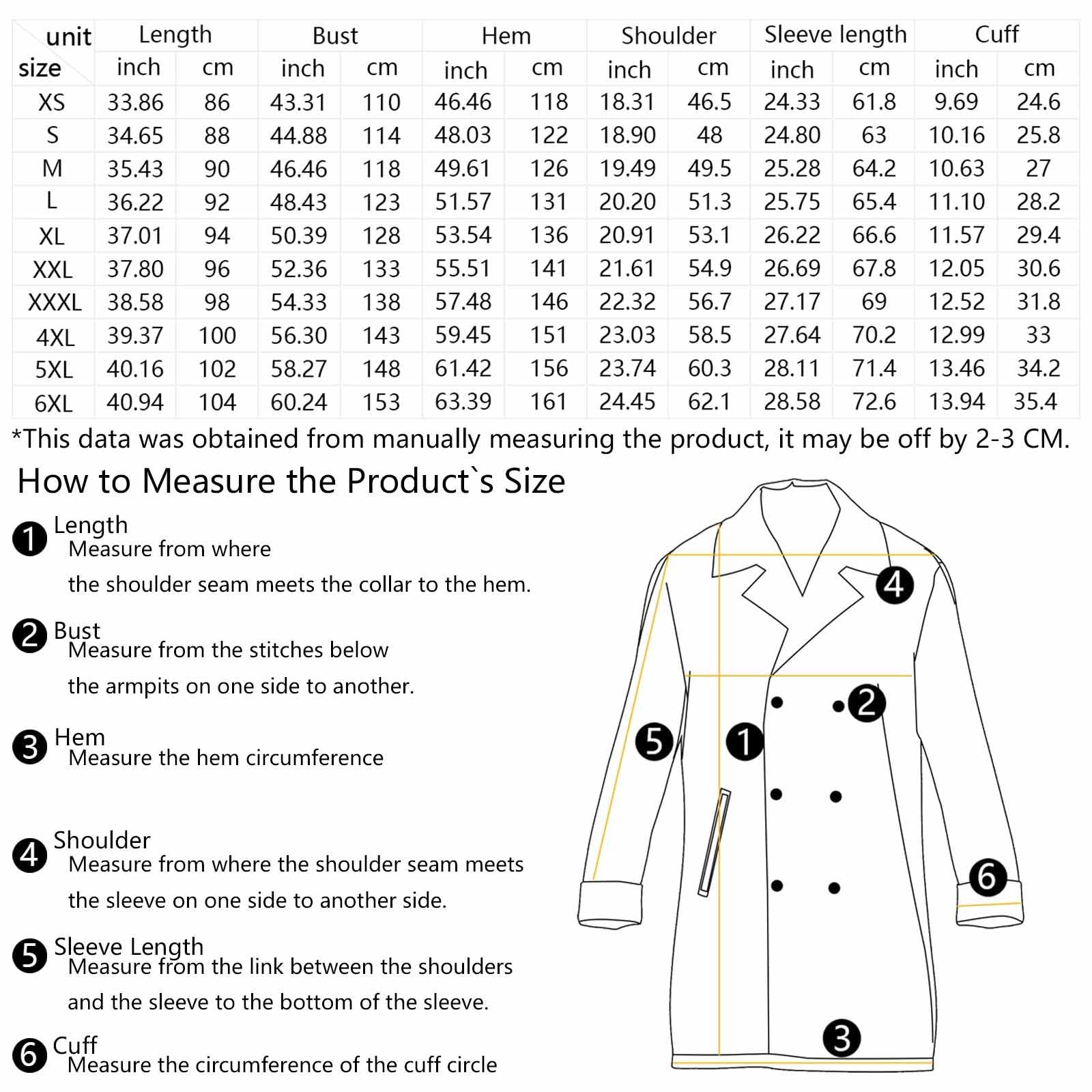 | Size | Length (cm/in) | Chest (cm/in) | Waist (cm/in) | 1/2 Shoulder (cm/in) | Sleeve Length (cm/in) | Cuff (cm/in) |