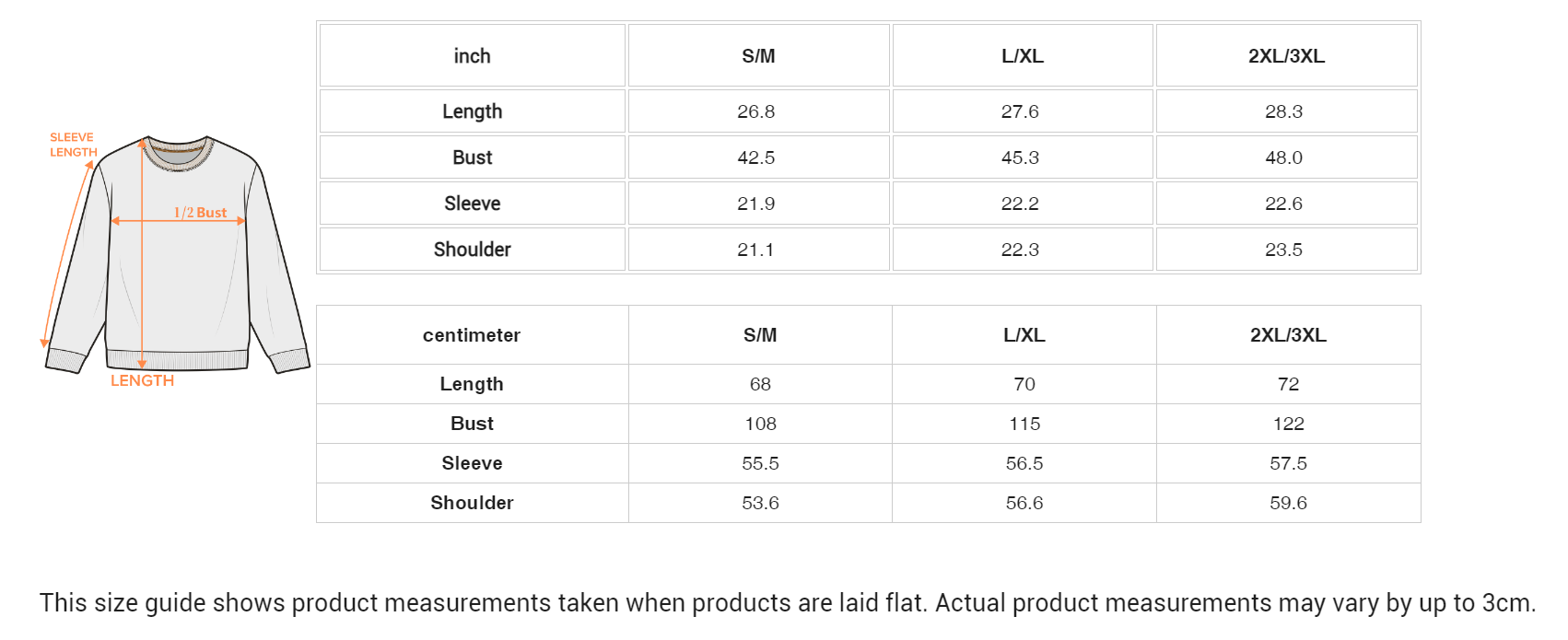 centimeter | S/M | L/XL | 2XL/3XL |