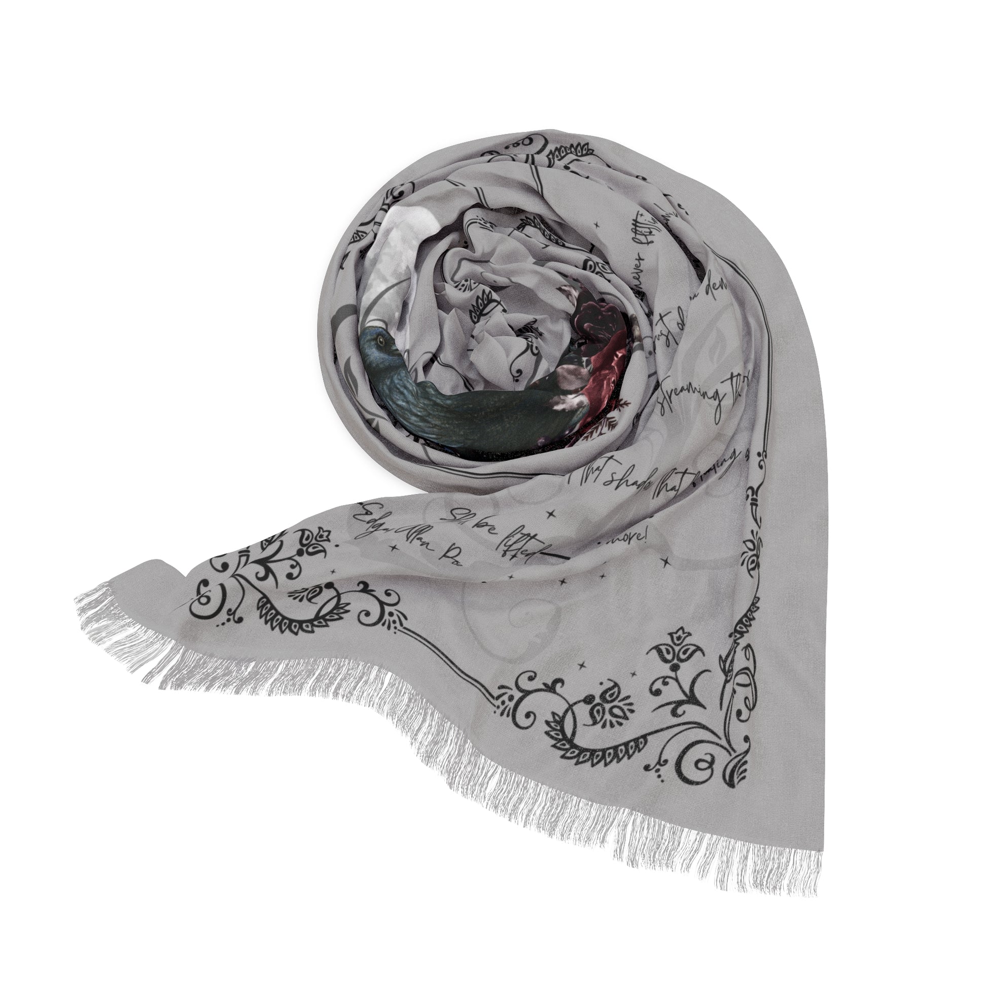The Raven by Edgar Allen Poe poem scarf that gives a gothic and literary vibe. Perfect for literature lovers, readers, and fans of poetry. Ideal for Halloween, gothic events, or everyday use to add a touch of mystery to your outfit.