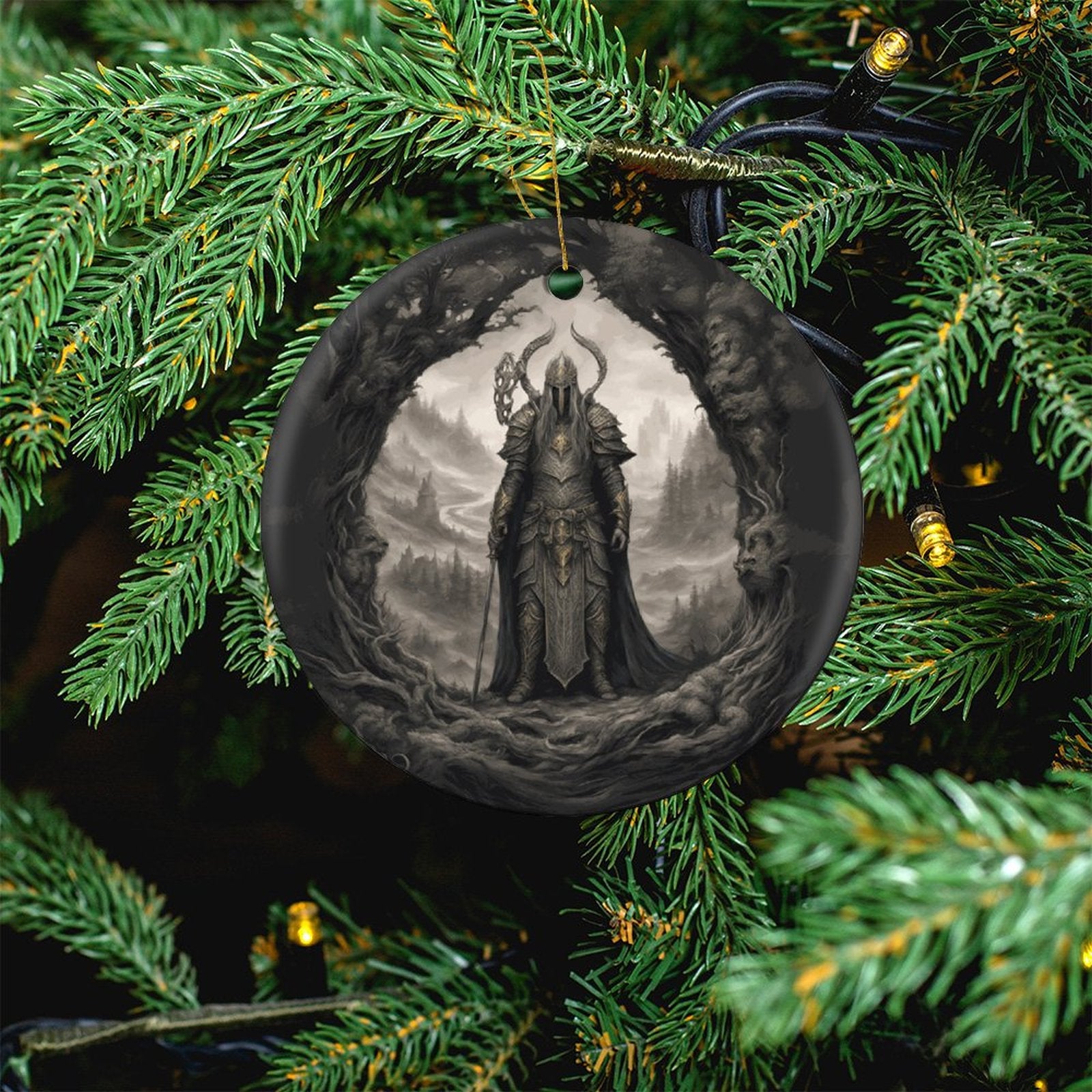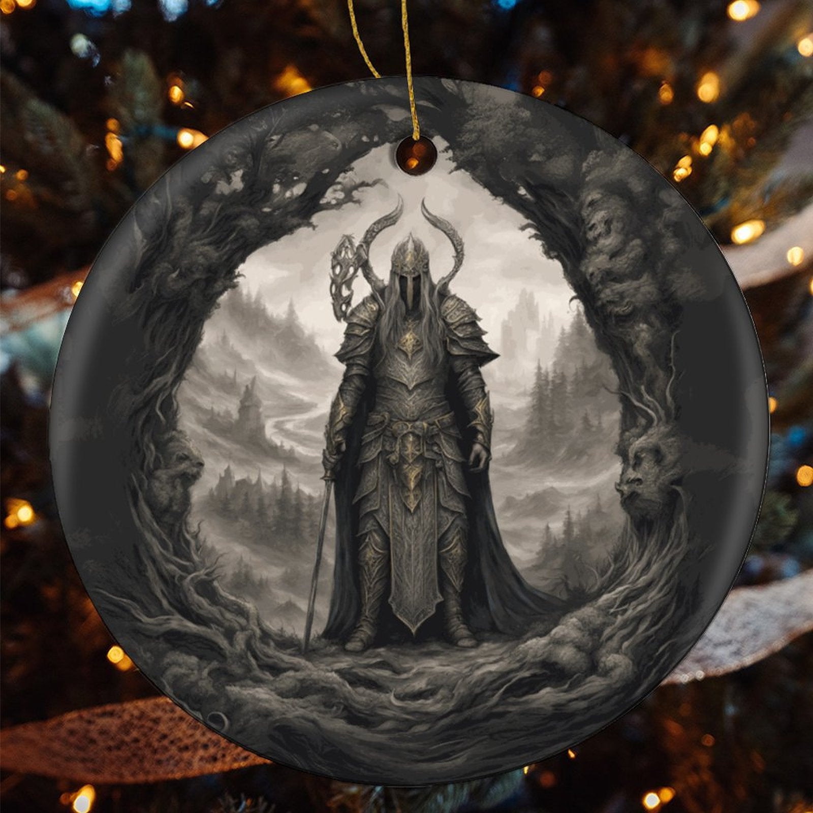 Elden Ring Warrior King Christmas Ceramic Ornament, adorned with the essence of Sephiroth, Age of Sigmar, Dark Souls, and Yule Gothic elegance