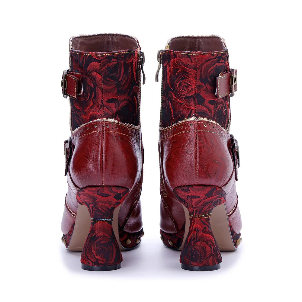 Step into style with these playful Johnature 2025 Autumn Winter red high-heeled boots. Handmade from genuine sheepskin leather, their patchwork print and belt buckle detail add a unique flair. The pointed toe and strange-style high heel (5-8cm) create a bold look, while the cotton lining and fabric insole keep your feet comfy. With a convenient zip closure and rubber outsole, these ankle boots fit true to size and are perfect for spring and autumn adventures. Add a splash of color and charm to your wardrobe with these eye-catching short boots!