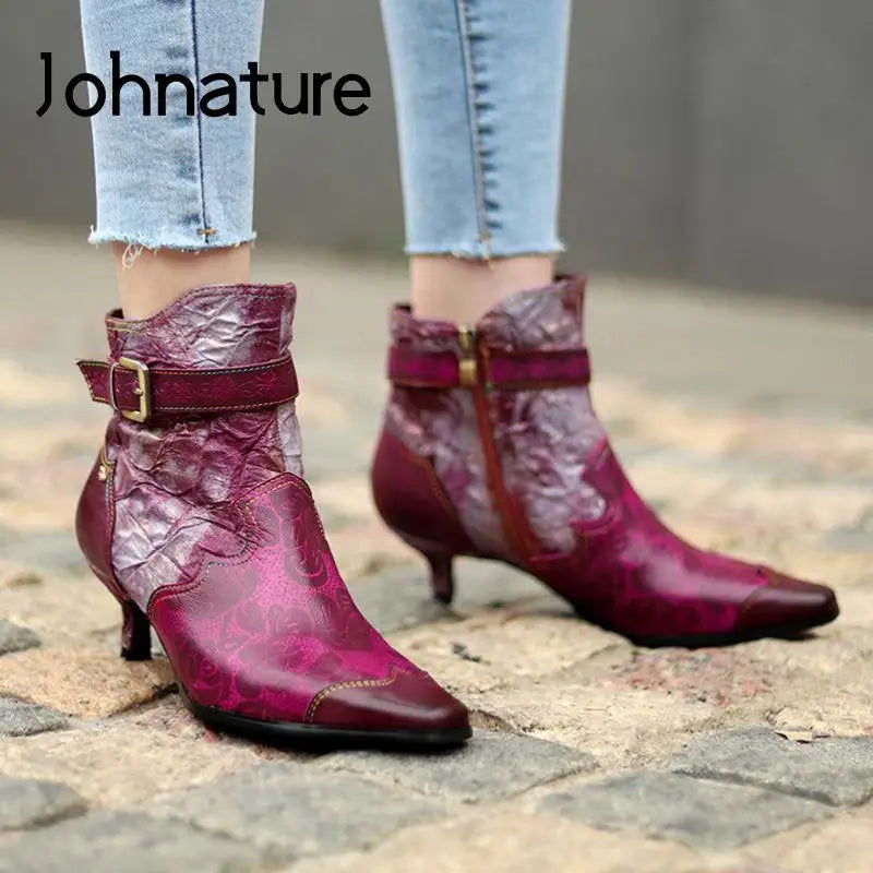 Johnature Genuine Leather Boots, Cloth Pointed Toe Zip 2025 New Handmade