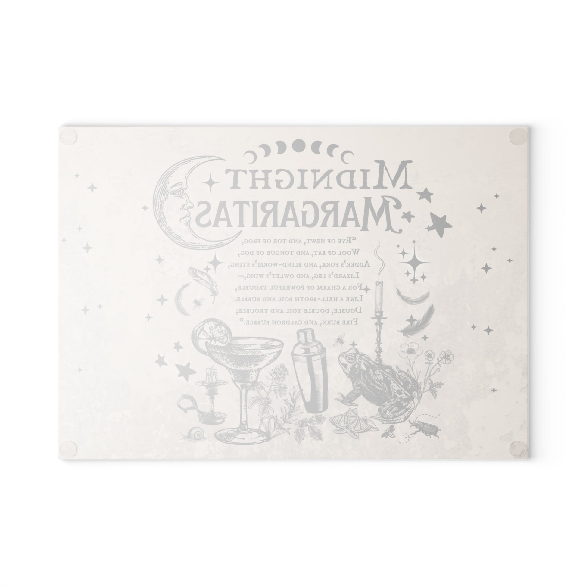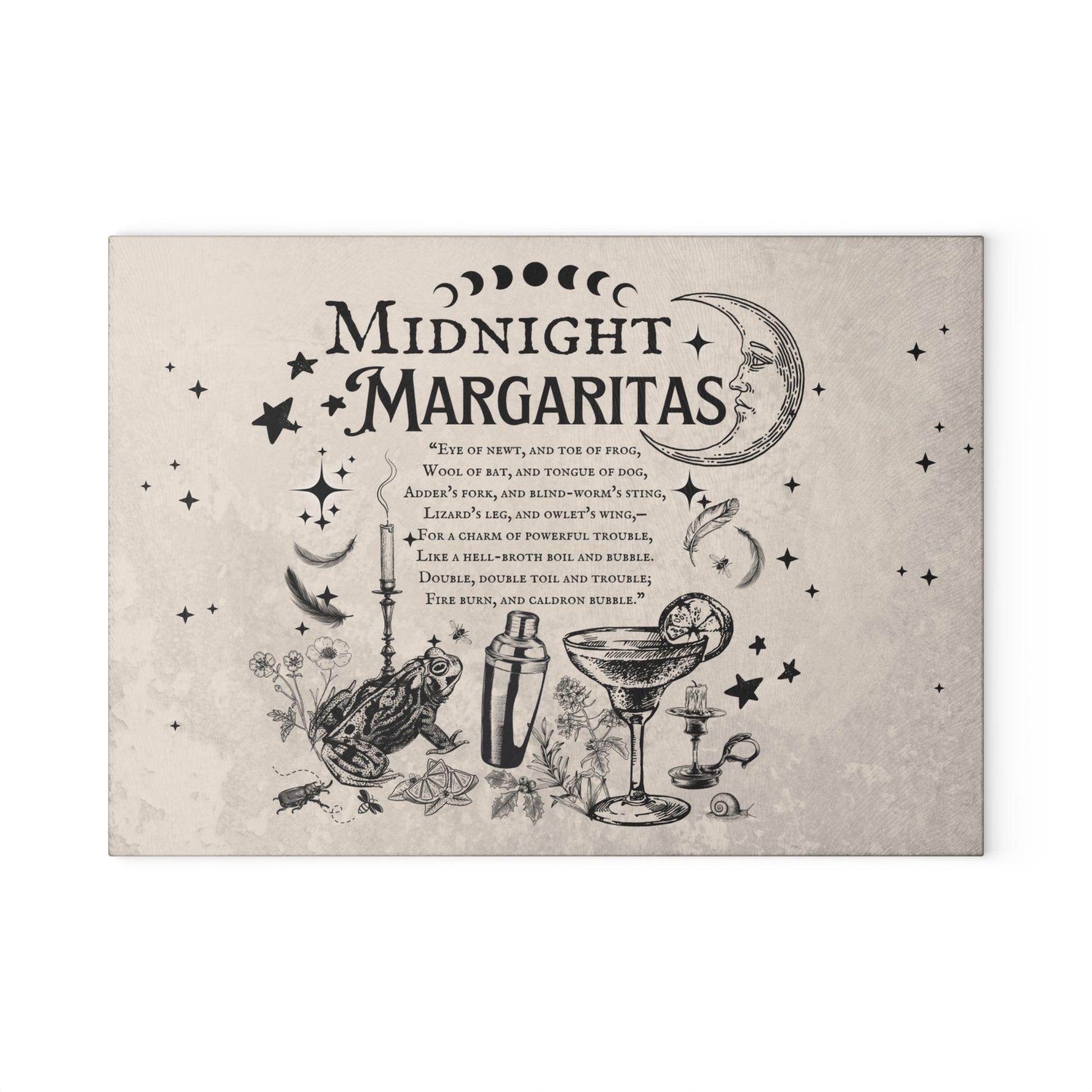 Bring a little moonlit magic to your kitchen with this tempered glass cutting board. The vintage-style “Midnight Margaritas” illustration—complete with crescent moon, cocktail glass, shaker, and scattered stars—feels like a late-night recipe whispered between friends.