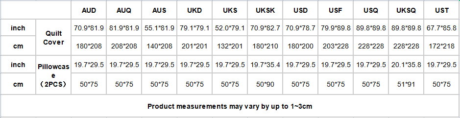 | inch | Pillowcase(2PCS) | 19.7*29.5 | 19.7*29.5 | 19.7*29.5 | 19.7*29.5 | 19.7*29.5 | 19.7*35.4 | 19.7*29.5 | 19.7*29.5 | 19.7*29.5 | 20.1*35.8 | 19.7*29.5 |