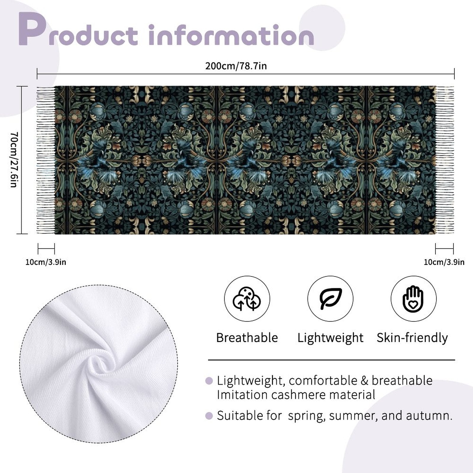 Crafted with quality cashmere-like material, our Cashmere-like Tassel Scarf boasts a luxurious softness and comfortable texture. The lightweight and breathable fabric ensure a comfortable wearing experience, allowing you to flaunt your style effortlessly. Featuring a sophisticated all-over printing technique, this Cashmere-like Tassel Scarf is customized to meet your unique demands, showcasing distinctive patterns that exude charm, confidence, and style on special occasions like parties, gatherings, and travels. Its timeless tassel style never goes out of fashion, seamlessly complementing a wide range of outfits, from coats and jackets to caps and jeans. With excellent color retention and durability, this Cashmere-like Tassel Scarf maintains its vibrant look even after prolonged use, making it a stylish and enduring addition to your wardrobe.